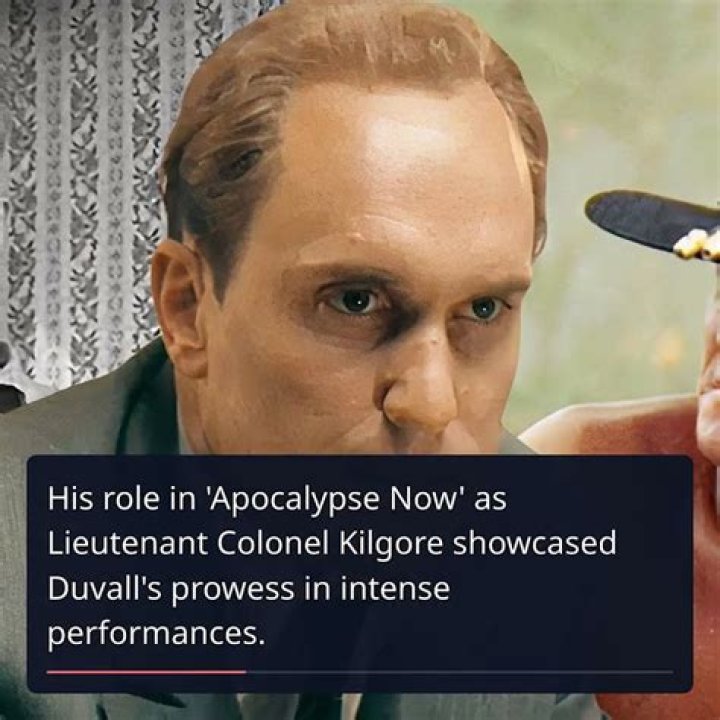 - Lieutenant Colonel Bill Kilgore in "Apocalypse Now" (1979) - Duvall's portrayal of the charismatic and ruthless officer is unforgettable, particularly for his famous line about loving the smell of napalm in the morning.